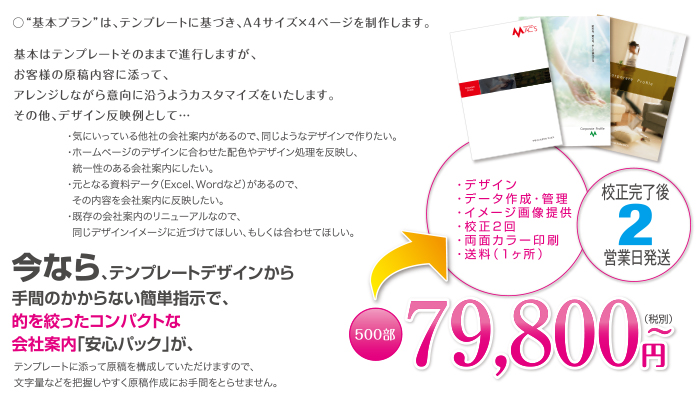 テンプレートから的を絞ったコンパクト会社案内(パンフレット)「安心パック」。印刷・デザイン作成・制作込みの格安設定で全国送料無料。